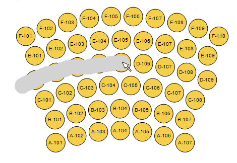 Finger Path selection is the BEST method if your venue is laid out with Curved Rows or Circular tables. This selection path is unique to Tick-It! Trak Pro, and REALLY speeds things up when using a Touch Screen Display for your POS Stations. Drag you finger along the CENTERS of the seats you want to select. Try not to "double back" on your path, as this will confuse the selection algorithm by de-selecting the seats you have already crossed.