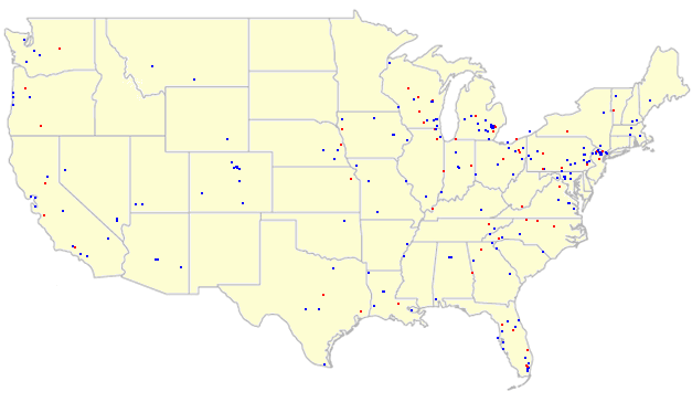 and their positions are approximate. Red Dots are Trak Pro Users, while Blue Dots represent our other products, 2K/97. Not all US Customers may appear due to missing
