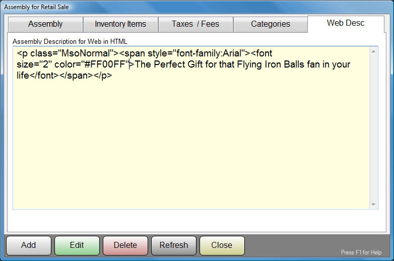 Finally, we can add any special HTML code that might be used to enhance the display of this Assembly on your web sales portal.