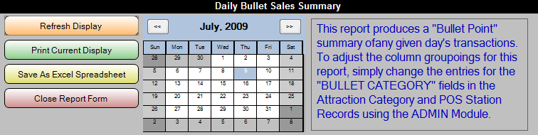 This report produces a managerial “bullet point” summary for any given day’s transactions.