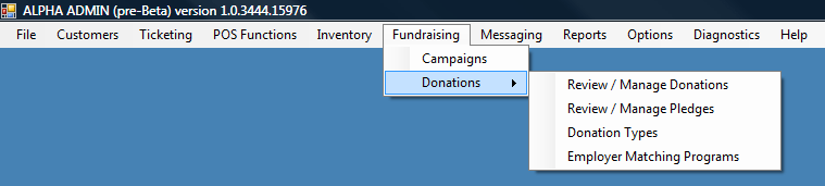 The Pledge Search screen provides a simple yet powerful way to cut through the clutter and zero in on the Pledges you want to look at. From the Main Menu, select FUNDRAISING, then REVIEW / MANAGE PLEDGES: