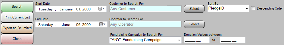 You MUST select the START and END dates for searching. The default is for TODAY. Optional search parameters include the Customer, Operator, a range of values for the donation amount, and the fundraising campaign. You may also select the field by which to sort the list, and whether to sort ascending or descending order.